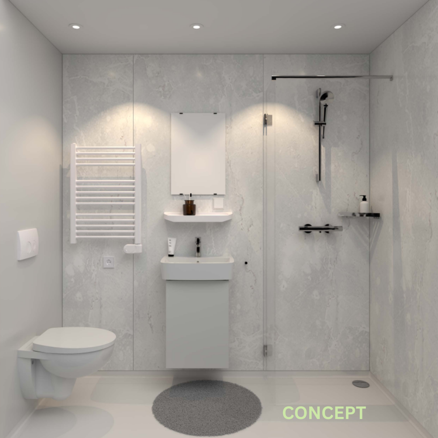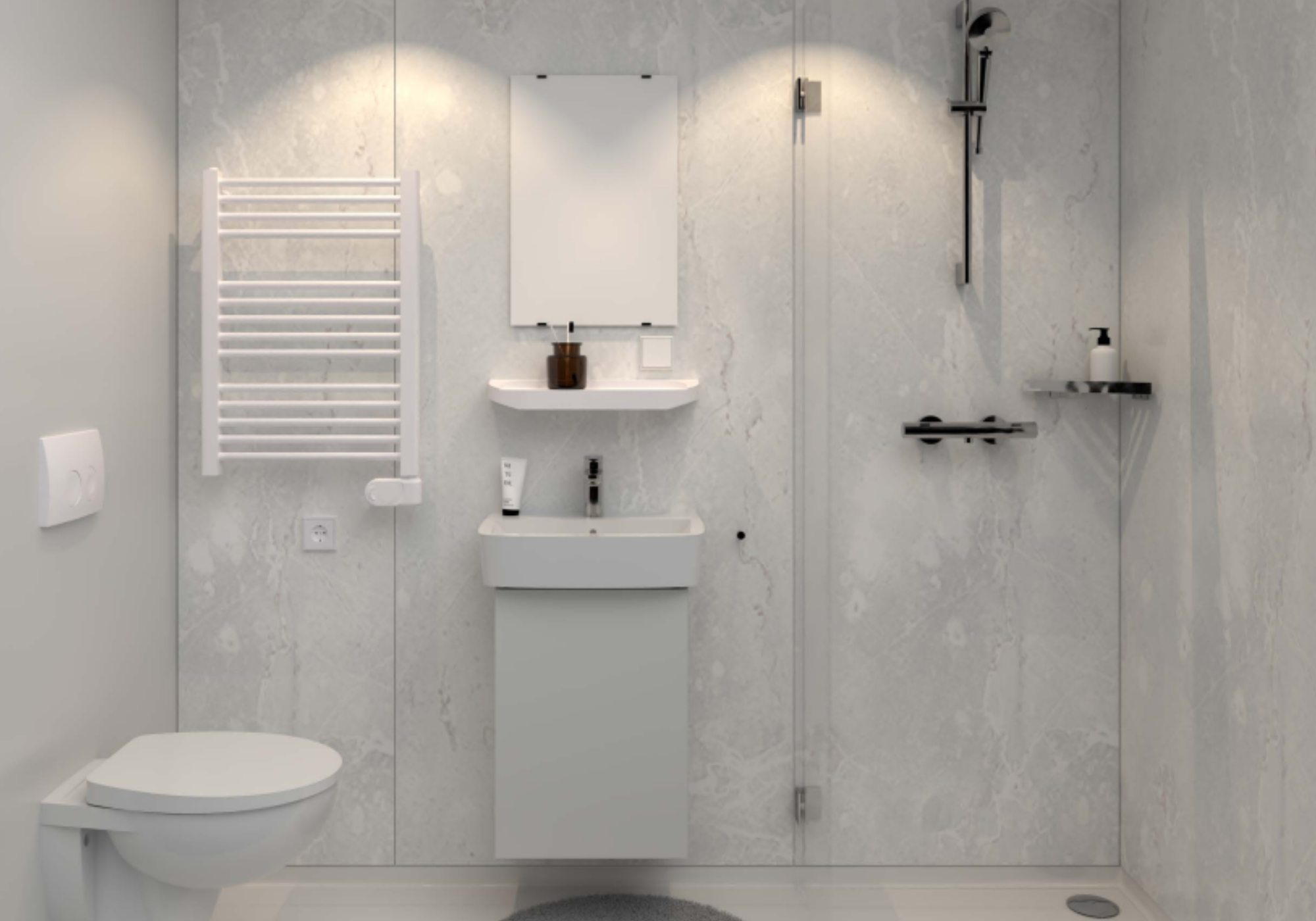 Na een lange dag - of juist bij een vroege start - is de badkamer jouw rustpunt. Alles voelt schoon en opgeruimd dankzij de lichte marmerlookafwerking op de wanden. De RVS kranen en strakke witte handdoekradiator maken het plaatje compleet. Douchen, poetsen, of schaamteloze shower singalongs? Hier voelt het gewoon goed.